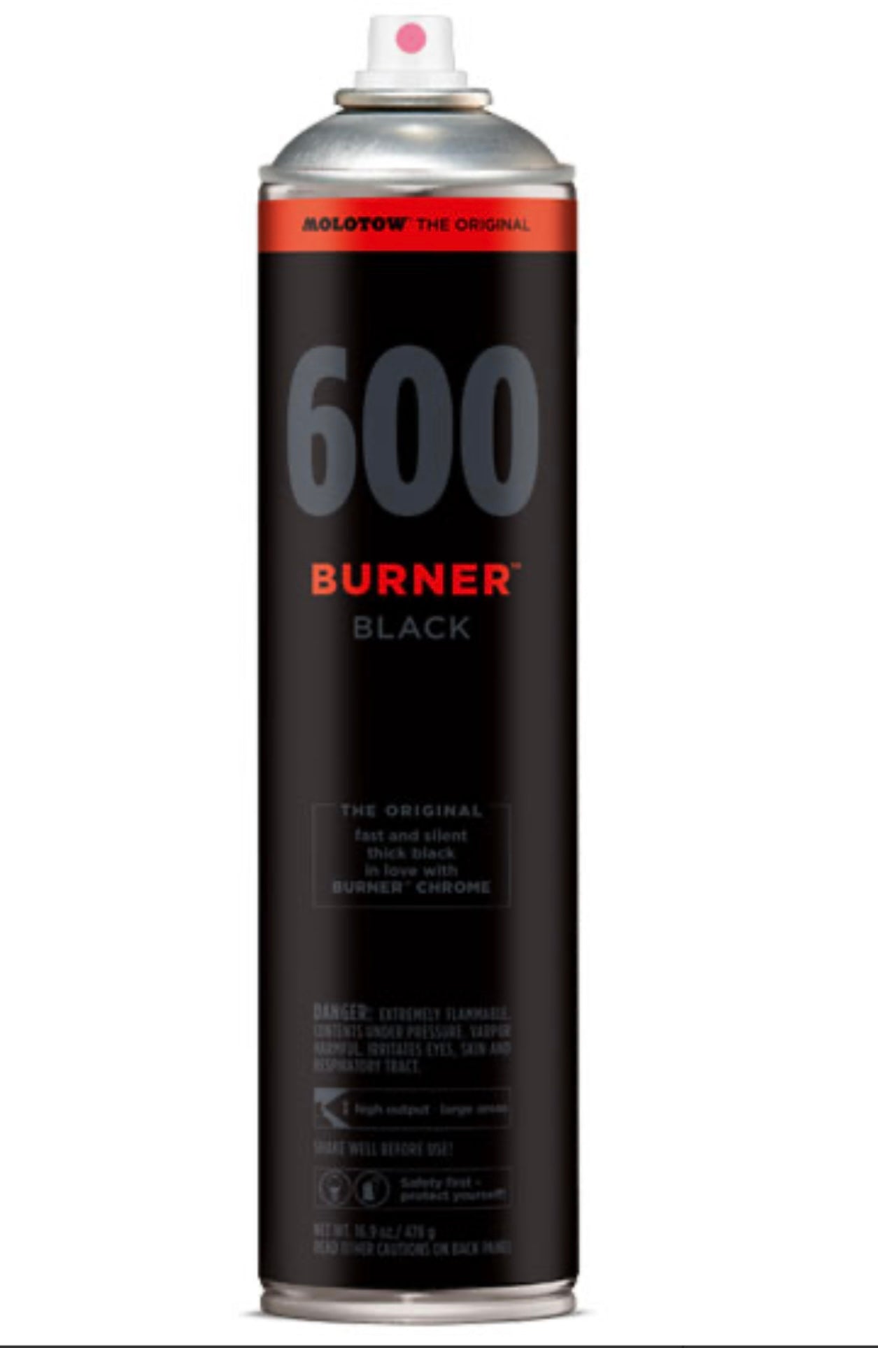 Paint it BLACK! Go BIG with the newly formulated 600ml Burner Black. This product will tame aspects of The Burner Metallic Paint line we have come to admire but challenged to outline. Cover over Burner Chrome, Gold, and Copper with this highly opaque (thick black), matte, quick-drying formula. Comes with mixing balls.