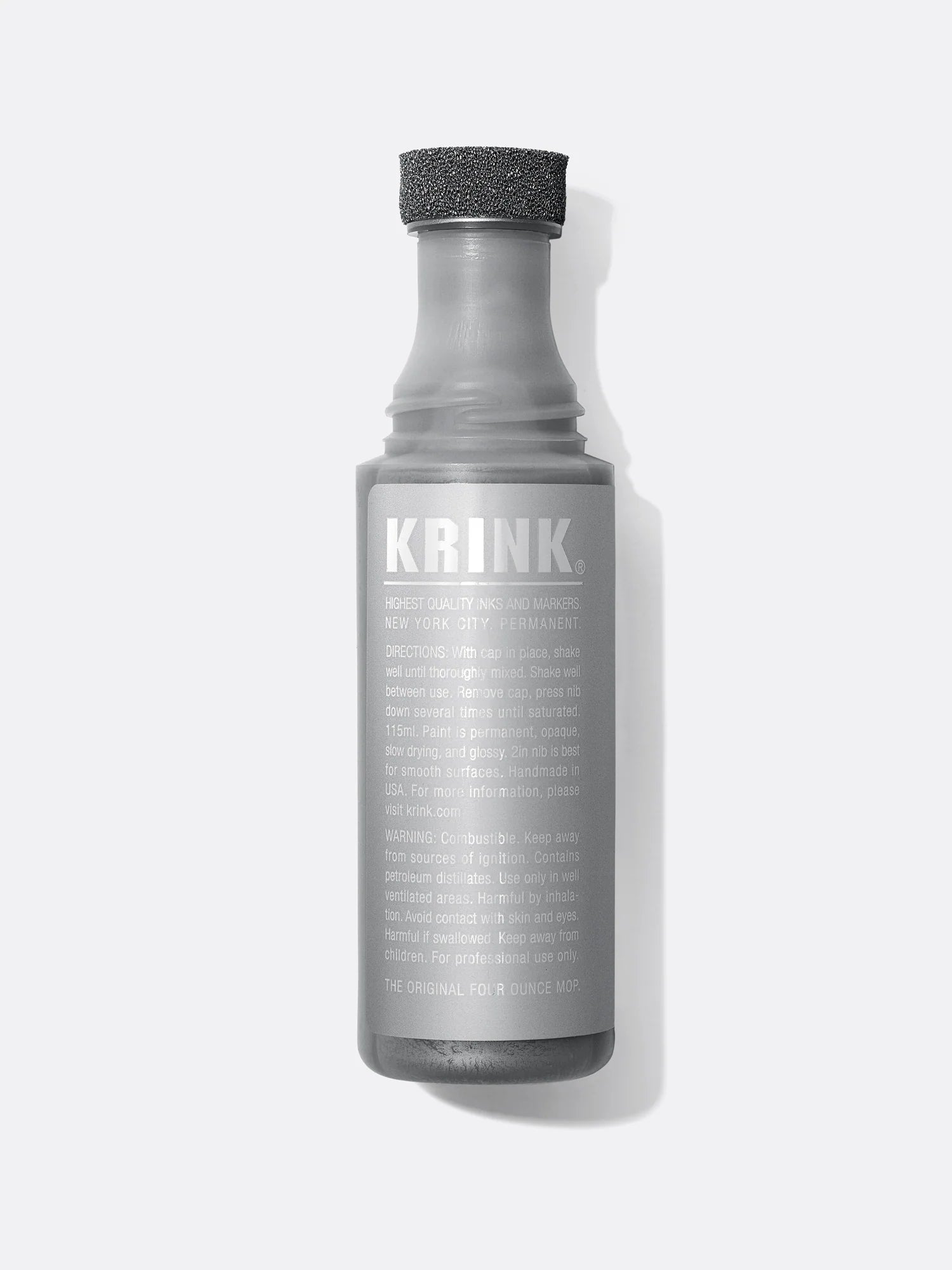 A Krink classic, this jumbo "shoe polish" squeezer mop is filled with Krink's signature glossy silver paint. Krink Silver is slow drying and performs best on smooth surfaces. Shake well and remember- this product is for professional use only. Handmade in the USA.